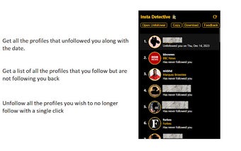 Unfollowers for Instagram - Insta Detective é uma extensão gratuita para o navegador Chrome que permite aos usuários monitorar suas interações no Instagram. Com esta ferramenta, é possível identificar quem deixou de seguir sua conta, ajudando a gerenciar suas conexões de maneira mais eficiente. A interface é simples e intuitiva, facilitando a navegação e o acesso às informações relevantes sobre seguidores e unfollowers.